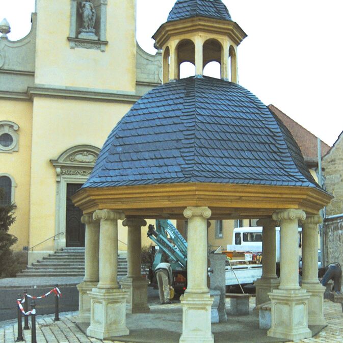 So konnten wir beispielsweise die Figur des Hl. Nepomuk in Zeuzleben vor dem Zerfall bewahren, an Balthasar Neumanns barockem Schloss Werneck den Südbalkon sanieren und das zerstörte Brunnenhaus in Ettleben, das als eines der schönsten Brunnenhäuser Unterfrankens galt und zerstört wurde, anhand von alten Fotografien rekonstruieren.